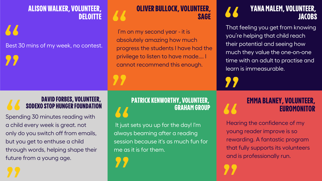 Our volunteers consistently tell us that giving 30 minutes of their time a week to read with a Chapter One child gives them a sense of wellbeing, reduces their stress levels, boosts their productivity, connects them to their colleagues and fosters a positive attitude to their work and employer.